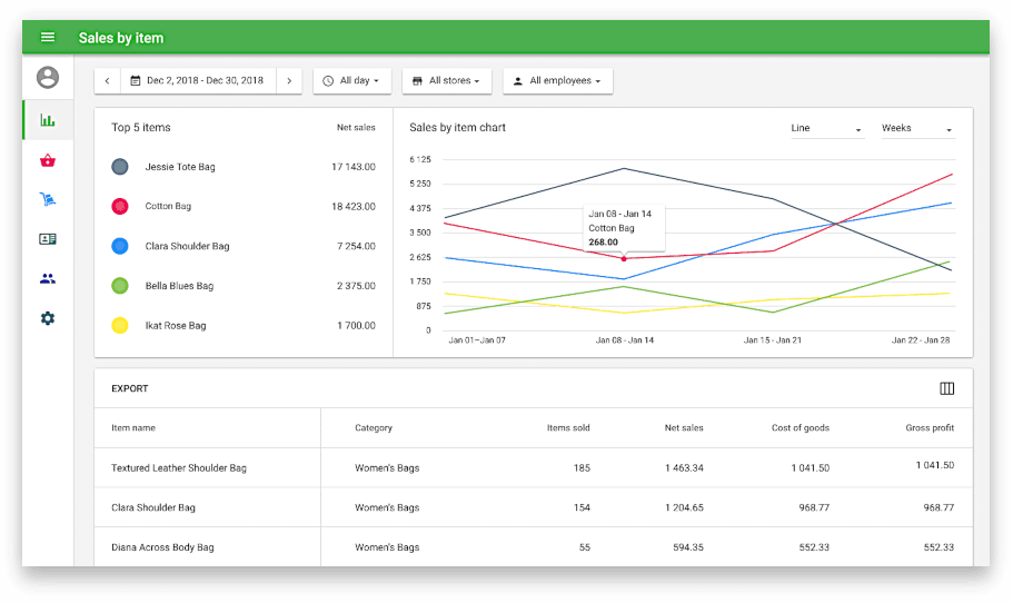 - Compare sales by different periods, stores, employees, check the important parameters at one page, such as gross sales, net sales, and gross profit, amounts of refunds made and given discounts.