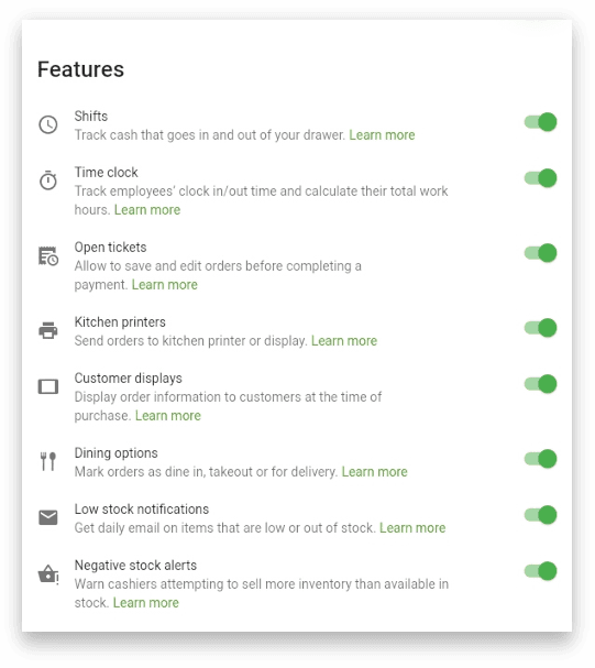 - Set up the features you need: shifts, time clock, open tickets, kitchen printers, customer displays, dining options, low stock notifications, negative stock alerts.